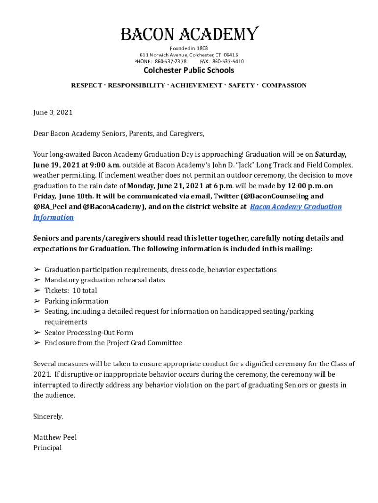 BACON ACADEMY Founded in 1803 611 Norwich Avenue, Colchester, CT 06415 PHONE: 8605372378 FAX: 8605375410Colchester Public Schools RESPECT RESPONSIBILITY ACHIEVEMENT SAFETY COMPASSION June 3, 2021,