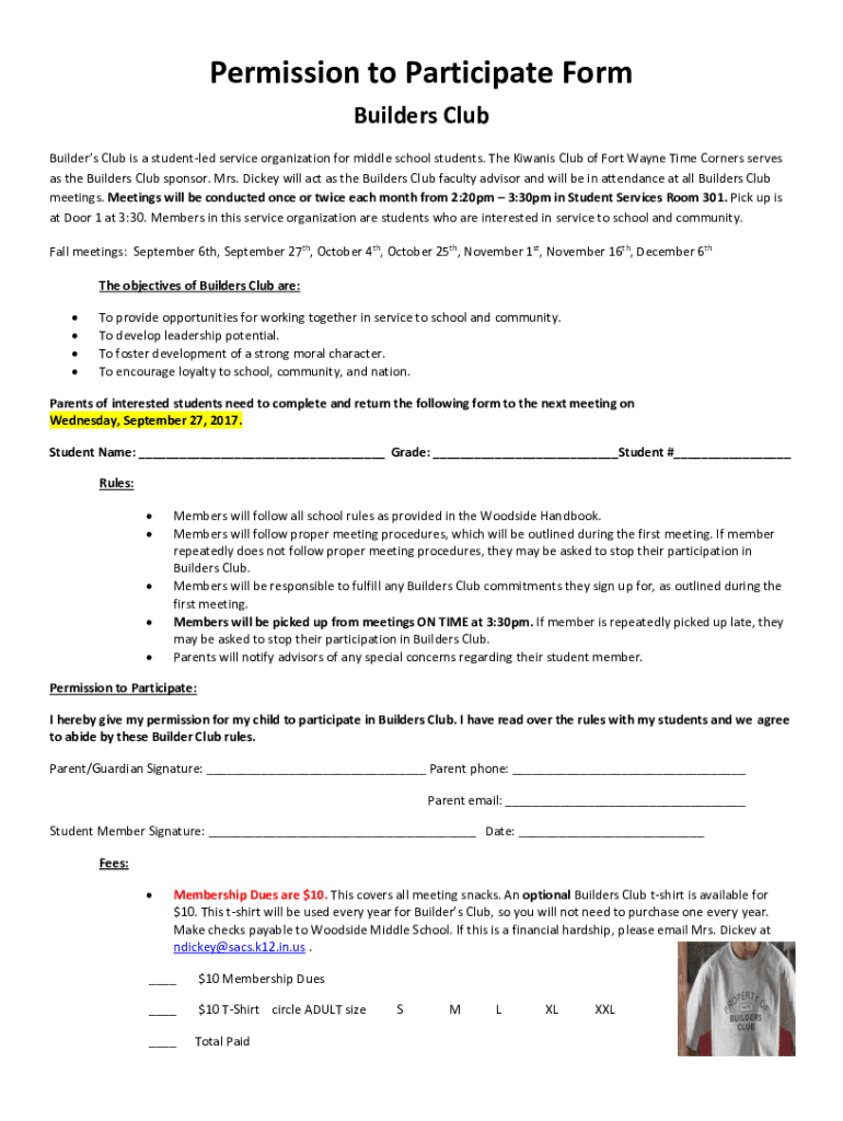 Permission to Participate Form Builders Club is a student led service organization for middle school students. The Kiwanis Club of Fort Wayne Time Corners serves as the Builders Club sponsor. Mrs.