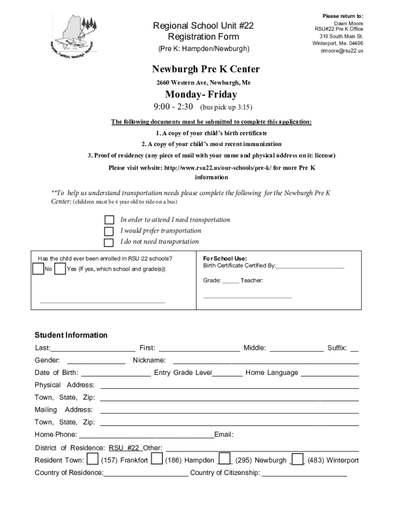 Regional School Unit #22 Registration Form (PRE K: Hamden/Newburgh)Please return to: Dawn Moore RSU#22 PRE K Office 319 South Main St. Winter port, Me. 04496 dmoore@rsu22.usNewburgh PRE K Center 2660