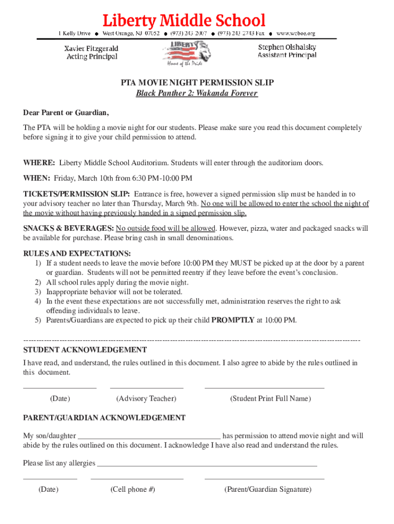 PTA MOVIE NIGHT PERMISSION SLIP Black Panther 2: Wakanda Forever Dear Parent or Guardian, The PTA will be holding a movie night for our students. Please make sure you read this document completely