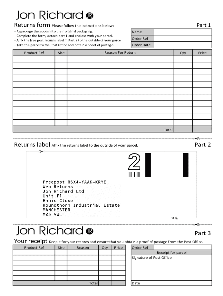 Returns form Please follow the instructions below:Part 1 Repackage the goods into their original packaging. Complete the form, detach part 1 and enclose with your parcel. Affix the free post returns
