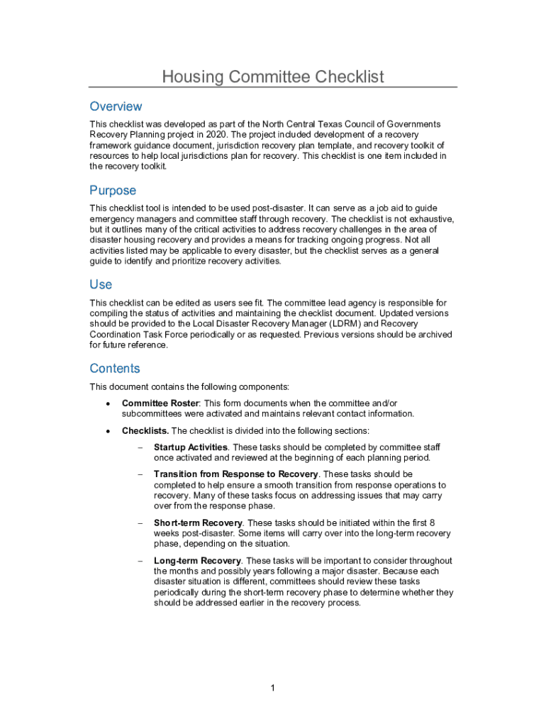 Housing Committee Checklist Overview This checklist was developed as part of the North Central Texas Council of Governments Recovery Planning project in 2020. The project included development of a