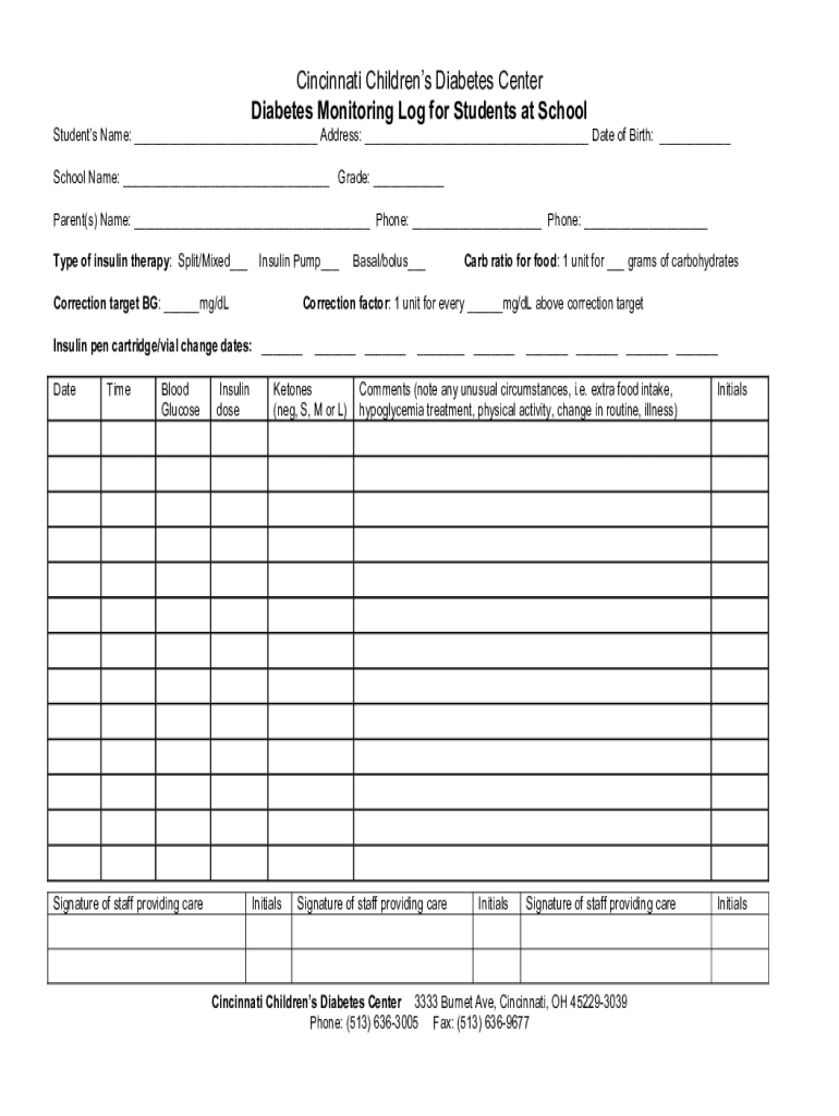 Diabetes Monitoring Log for Students at SchoolStudents Name: ___ Address: ___ Date of Birth: ___