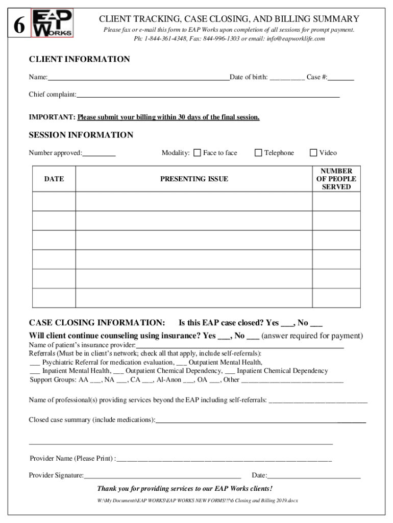 CLIENT TRACKING, CASE CLOSING, AND BILLING SUMMARY6Please fax or email this form to EAP Works upon completion of all sessions for prompt payment. PH: 18443614348, Fax: 8449961303 or email: info@eapworklife.comCLIENT
