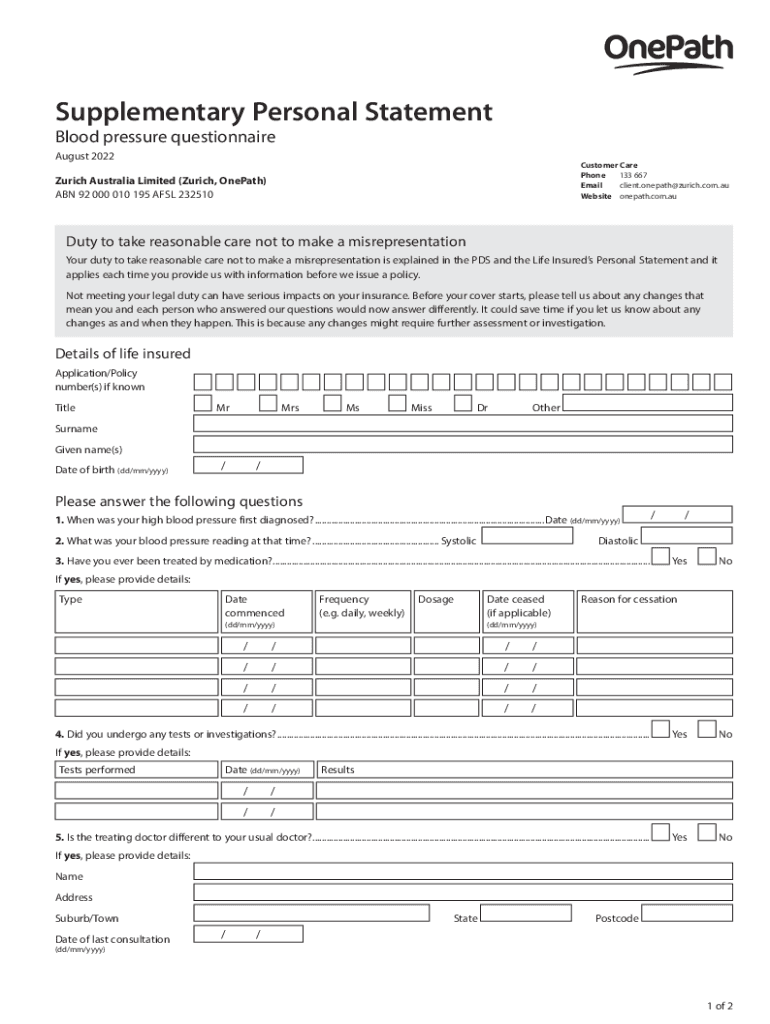 Supplementary Personal Statement Blood pressure questionnaire August 2022Customer Care Phone133 667 Email client.onepath@zurich.com.au Websiteonepath.com. Zurich Australia Limited (Zurich, Neath)