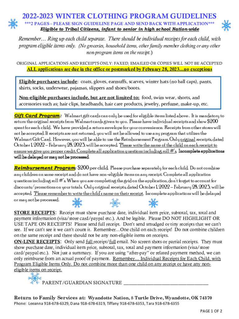 20222023 WINTER CLOTHING PROGRAM GUIDELINES ***2 PAGES PLEASE SIGN GUIDELINE PAGE AND SEND BACK WITH APPLICATION*** Eligible to Tribal Citizens, infant to senior in high school NationwideRemember