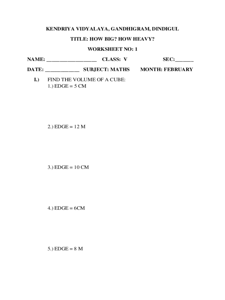 KENDRA HIMALAYA, GANDHIAN, INDIGO TITLE: HOW BIG? HOW HEAVY? WORKSHEET NO: 1 NAME: ___ CLASS: V DATE: ___ SUBJECT: Math I.)FIND THE VOLUME OF A CUBE: 1.) EDGE 5 CM2.) EDGE 12 M3.) EDGE 10 CM4.) EDGE