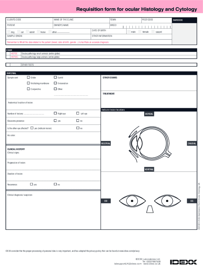 Requisition form for ocular Histology and Cytology BY CLIENT\'S CODEPATIENTdogcatrabbithorseSAMPLE ORIGINATE OF THE CLINICTOWNOWNER\'S NAMEBREEDotherDATE OF BIRTH POST CODEmalefemaleBARCODEspayedOTHER
