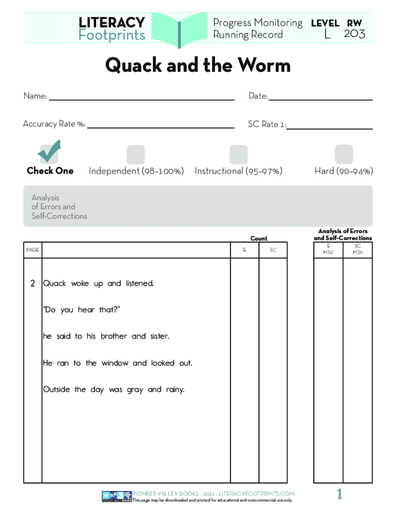 Progress Monitoring LEVEL RAW Running Record L 203Quack and the Worm Name:Date:Accuracy Rate %:SC Rate 1:Check Nonindependent (98100%)Instructional (9597%)Hard (9094%)Analysis of Errors and SelfCorrections