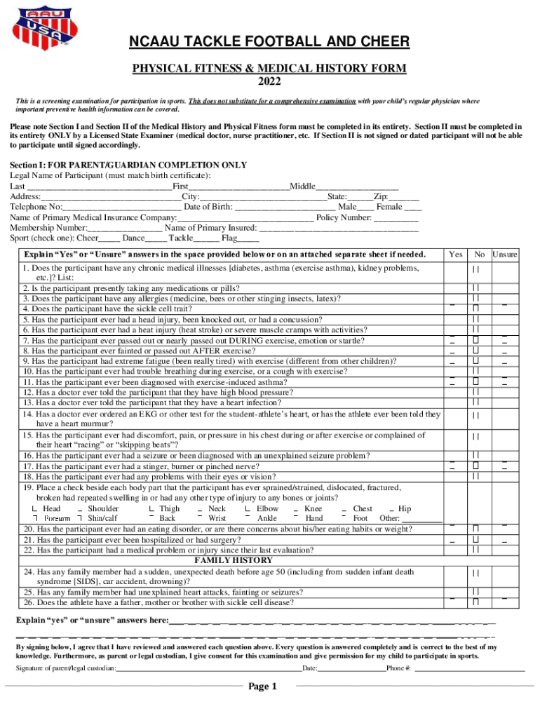 NCAA TACKLE FOOTBALL AND CHEER PHYSICAL FITNESS & MEDICAL HISTORY FORM 2022 This is a screening examination for participation in sports. This does not substitute for a comprehensive examination with