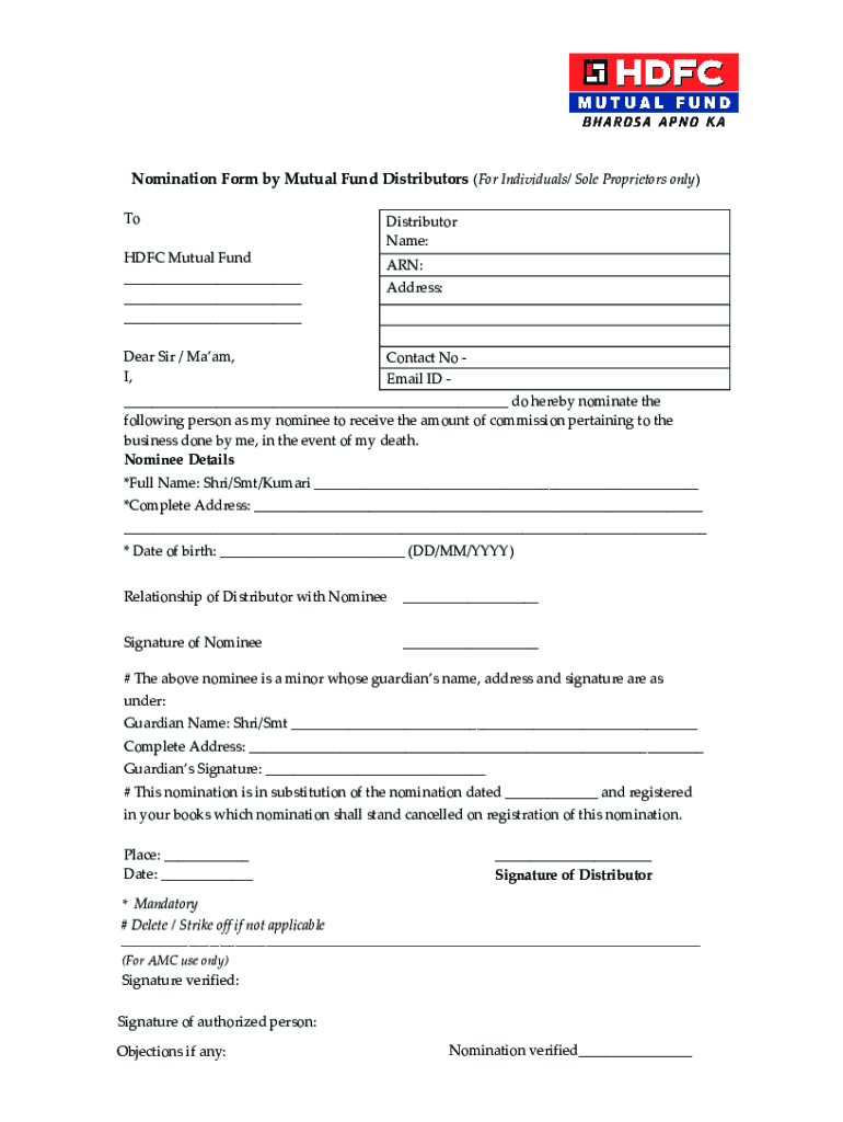 Nomination Form by Mutual Fund Distributors (For Individuals/ Sole Proprietors only) To HDFC Mutual Fund ___ ___ ___Distributor Name: ARN: Address:Dear Sir / Madam, I, Contact No Email ID ___ do hereby