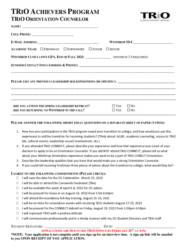 TRIO ACHIEVERS PROGRAM TRIO ORIENTATION COUNSELOR NAME: ___CELL PHONE: ___ EMAIL ADDRESS: ___ ACADEMIC YEAR: FRESHMAN SOPHOMORE JUNIORWINTHROP ID #___ SENIORWINTHROP CUMULATIVE GPA, END OF FALL 2021: