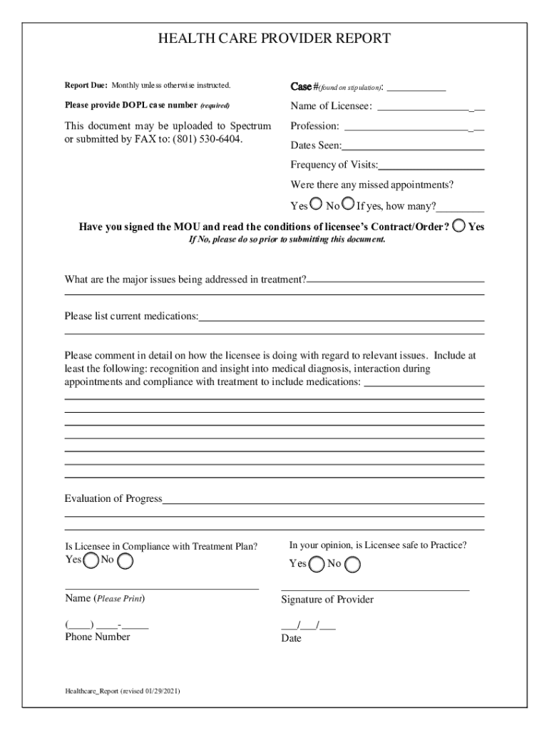 HEALTH CARE PROVIDER REPORT Due: Monthly unless otherwise instructed. Case #(found on stipulation): ___Please provide DOLL case number (required)Name of Licensee: ___This document may be uploaded