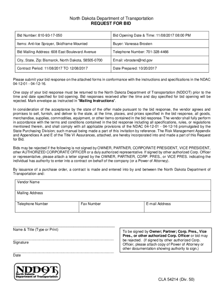 REQUEST FOR BID Number: 8109317050Bid Opening Date & Time: 11/08/2017 08:00 Items: AntiIce Sprayer, Skid frame MountedBuyer: Vanessa BrostenBid Mailing Address: