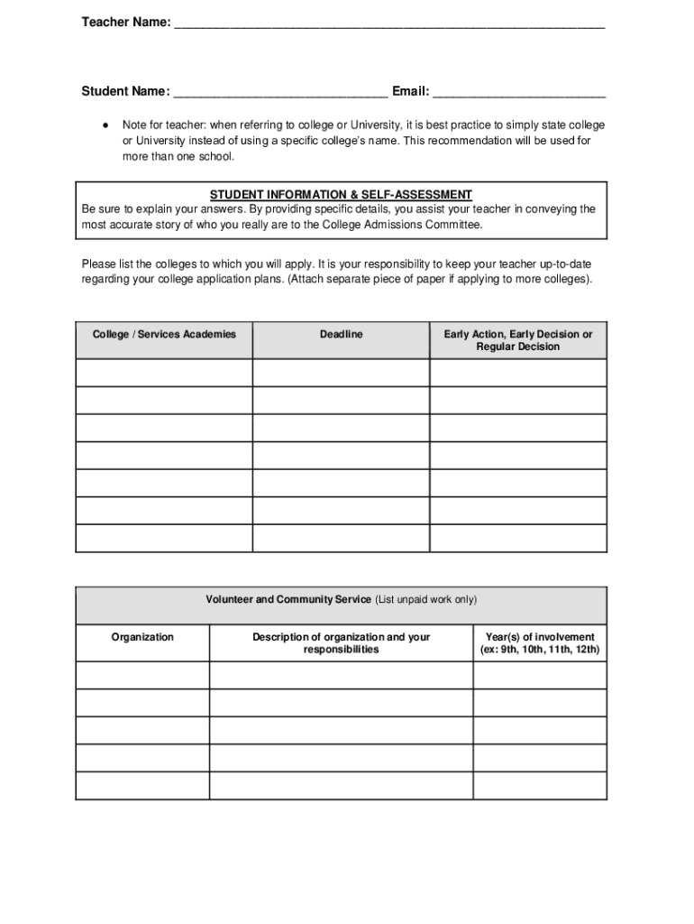 Teacher Name: ___Student Name: ___ Email: ___ Note for teacher: when referring to college or University, it is best practice to simply state college or University instead of using a specific colleges