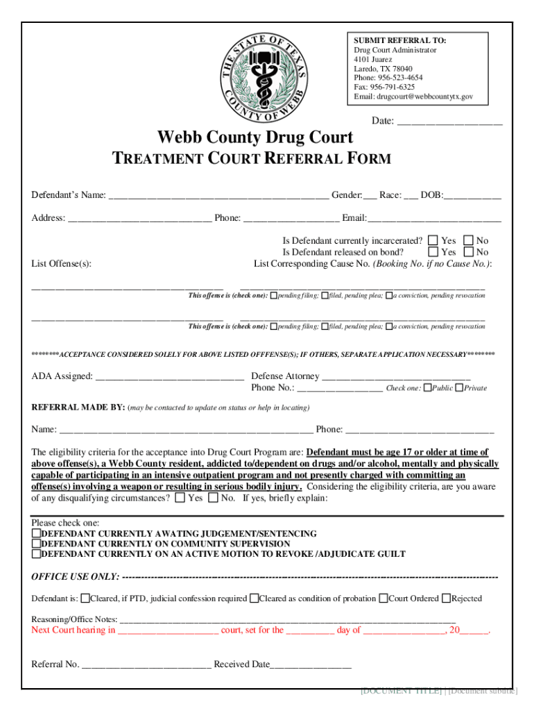 SUBMIT REFERRAL TO: Drug Court Administrator 4101 Juarez Laredo, TX 78040 Phone: 9565234654 Fax: 9567916325 Email: drugcourt@webbcountytx.govDate: ___Webb County Drug Court TREATMENT COURT REFERRAL