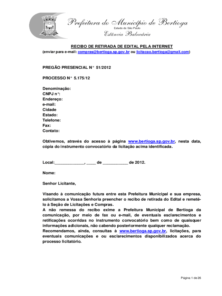 (Elvira para email: compras@bertioga.sp.gov.br of licitacao.bertioga@gmail.com)PRESO PRESENCE N 51/2012