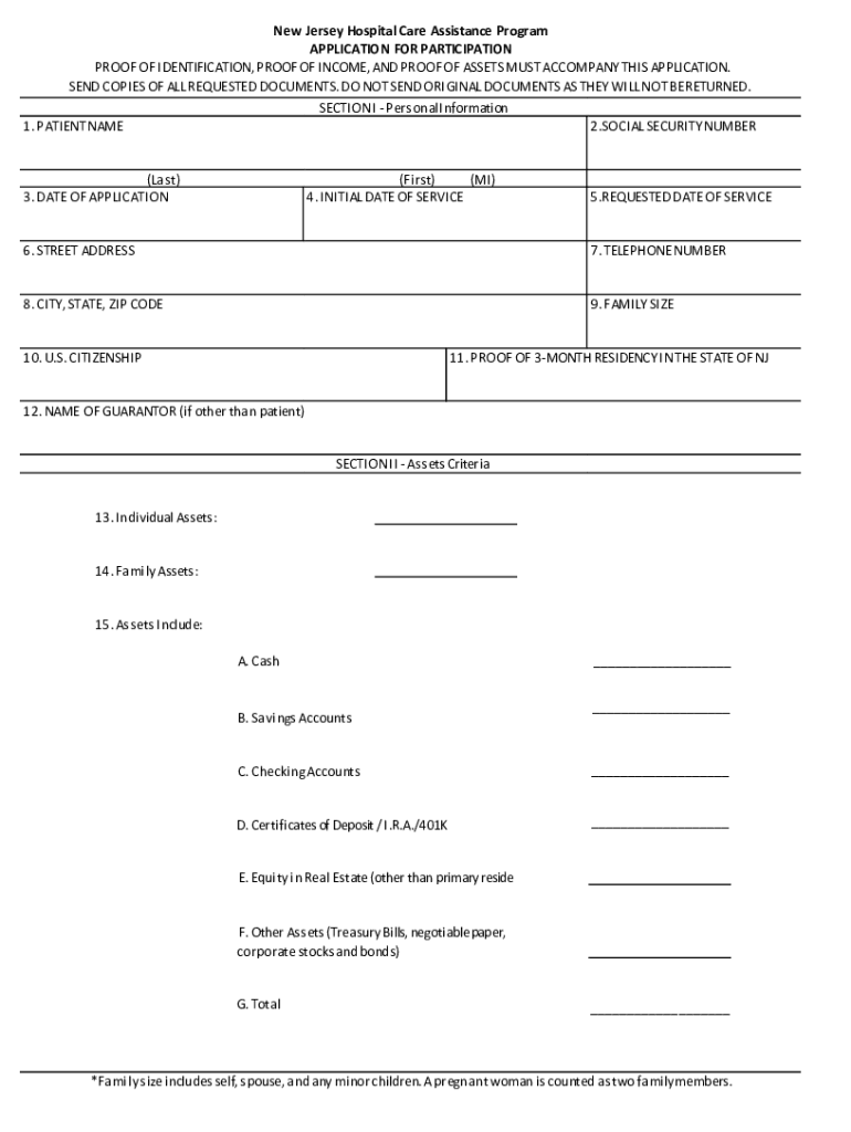 New Jersey Hospital Care Assistance Program APPLICATION FOR PARTICIPATION PROOF OF IDENTIFICATION, PROOF OF INCOME, AND PROOF OF ASSETS MUST ACCOMPANY THIS APPLICATION. SEND COPIES OF ALL REQUESTED