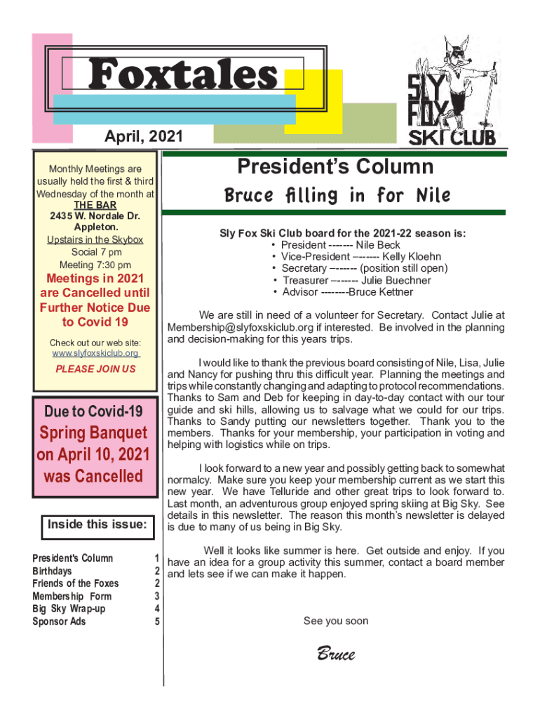Fox tales April 2021 Monthly Meetings are usually held the first & third Wednesday of the month at THE BAR 2435 W. Nor dale Dr. Appleton. Upstairs in the Skybox Social 7 pm Meeting 7:30 meetings in