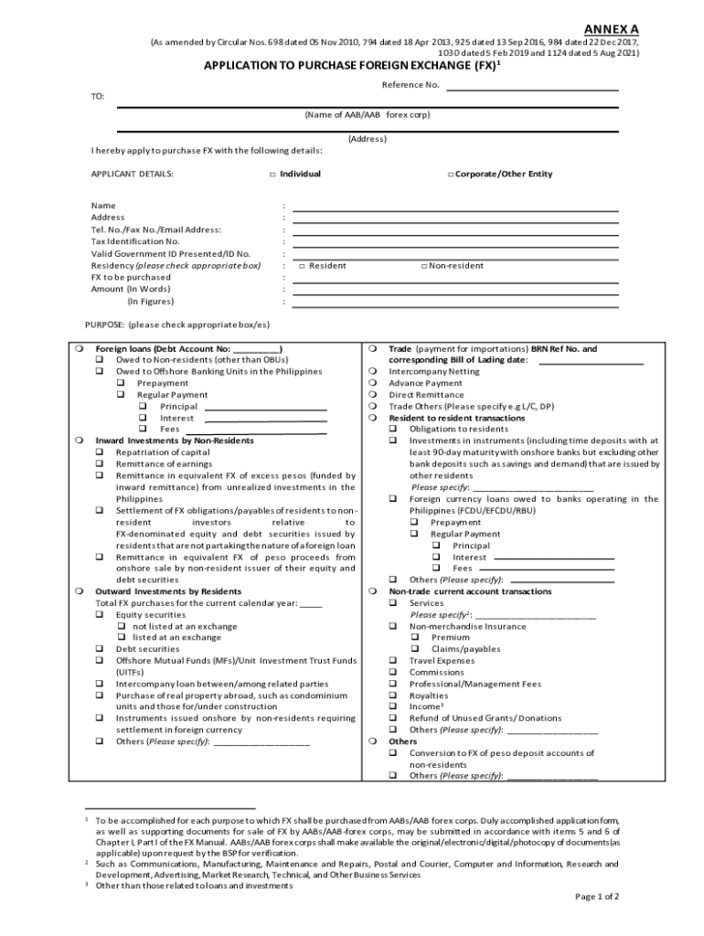 Application to purchase foreign is a form used to request permission to buy foreign currency or foreign assets.
