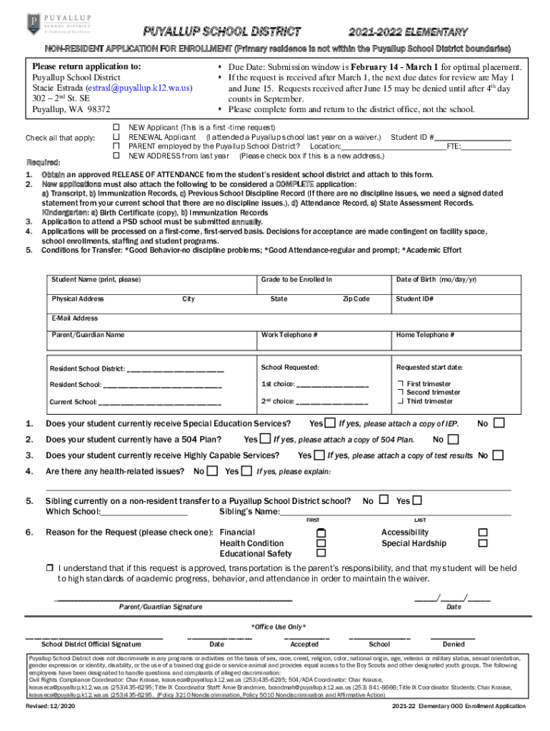 PUYALLUP SCHOOL DISTRICT20212022 ELEMENTARYNONRESIDENT APPLICATION FOR ENROLLMENT (Primary residence is not within the Puyallup School District boundaries) Due Date: Submission window is February