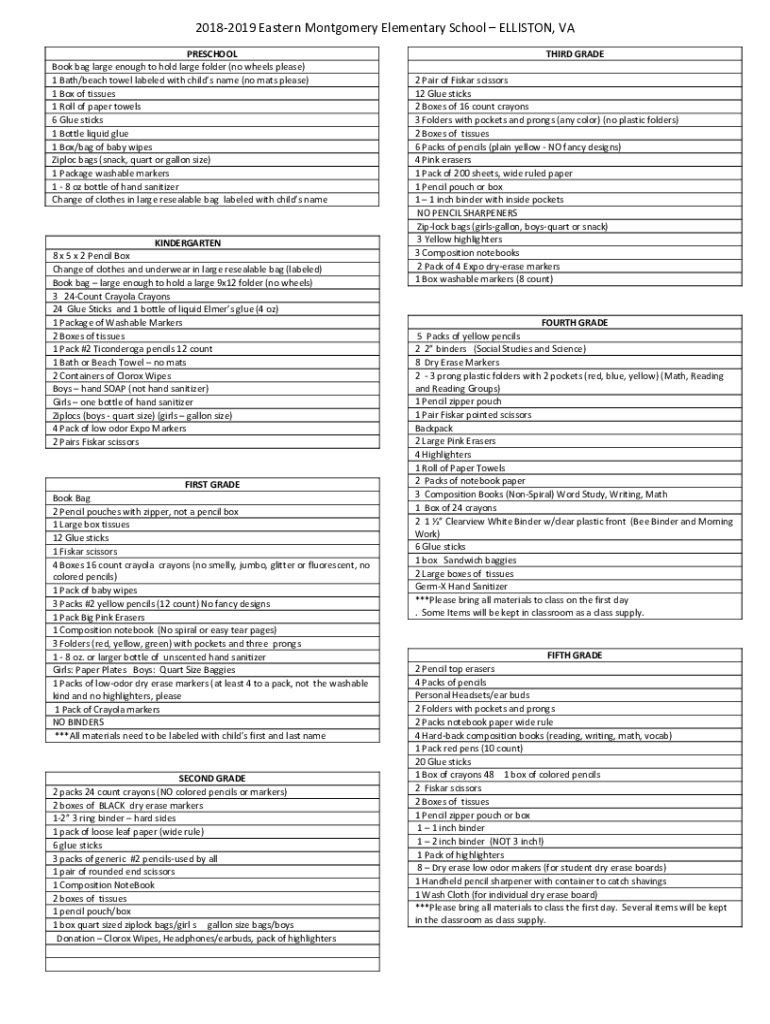 20182019 Eastern Montgomery Elementary School ELLISON, VA PRESCHOOL Book bag large enough to hold large folder (no wheels please) 1 Bath/beach towel labeled with children name (no mats please) 1 Box