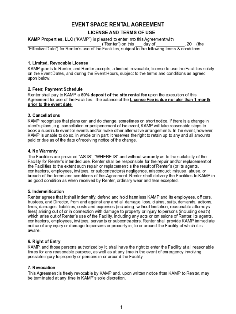 EVENT SPACE RENTAL AGREEMENT LICENSE AND TERMS OF USE CAMP Properties, LLC (CAMP) is pleased to enter into this Agreement with ___ (Renter) on this ___ day of ___, 20 (the Effective Date) for Renters