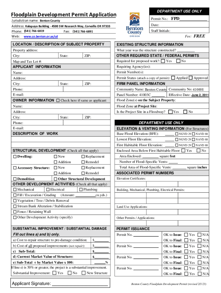 DEPARTMENT USE ONLYFloodplain Development Permit ApplicationPermit No.:Jurisdiction name: Benton County Address: Malaya Building 4500 SW Research Way, Corvallis OR 97333 Phone: (541) 7666819 Fax: