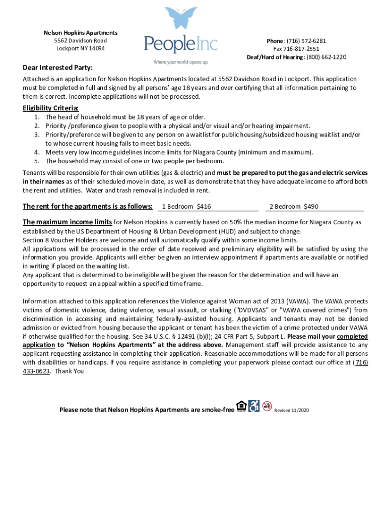 Nelson Hopkins Apartments 5562 Davidson Road Lock port NY 14094Phone: (716) 5726281 Fax 7168172551 Deaf/Hard of Hearing: (800) 6621220Dear Interested Party: Attached is an application for Nelson Hopkins