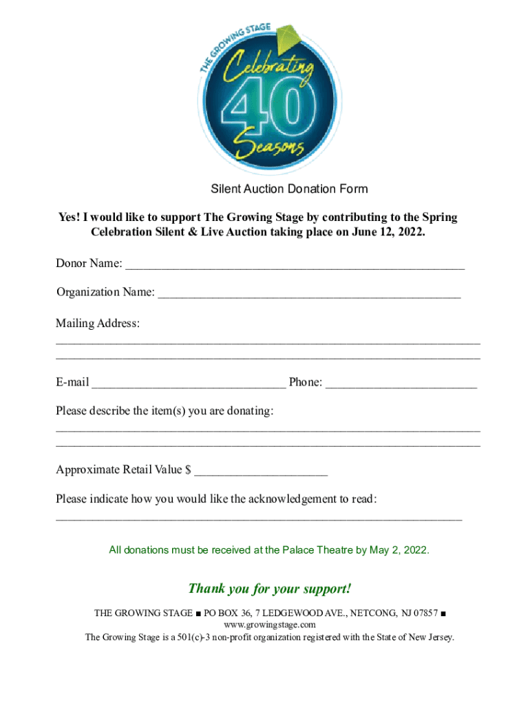 Silent Auction Donation Form Yes! I would like to support The Growing Stage by contributing to the Spring Celebration Silent & Live Auction taking place on June 12, 2022. Donor Name: ___ Organization