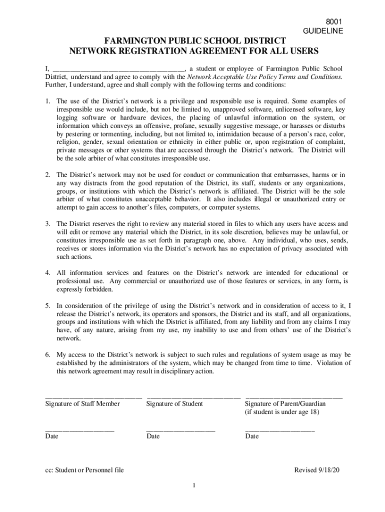 8001 GUIDELINEFARMINGTON PUBLIC SCHOOL DISTRICT NETWORK REGISTRATION AGREEMENT FOR ALL USERS, ___, a student or employee of Farmington Public School District, understand and agree to comply with the