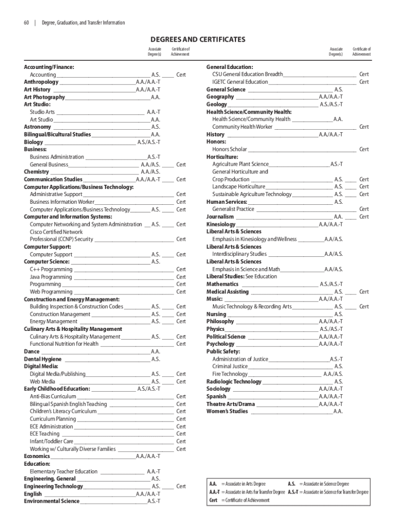60 |Degree, Graduation, and Transfer InformationDEGREES AND CERTIFICATES Associate Degree(s)Certificate of AchievementAccounting/Finance: Accounting ___ A.S. ___ Anthropology ___A. A./A.A.T Art History