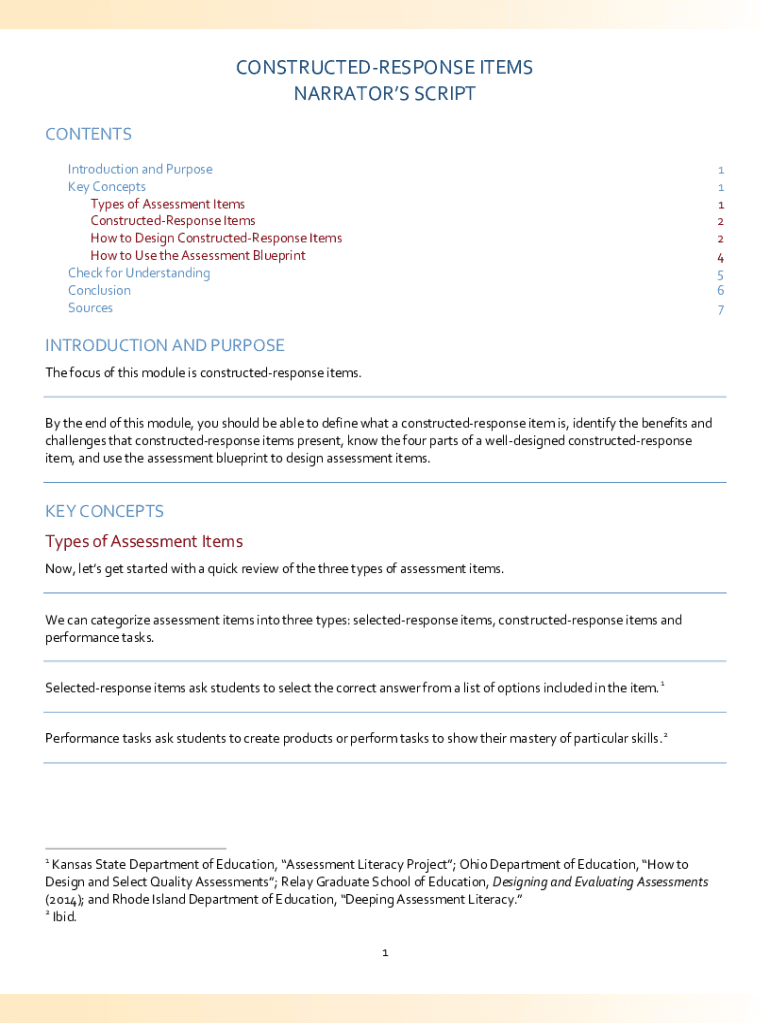 CONSTRUCTEDRESPONSE ITEMS NARRATORS SCRIPT CONTENTS Introduction and Purpose Key Concepts Types of Assessment Items ConstructedResponse Items How to Design ConstructedResponse Items How to Use the