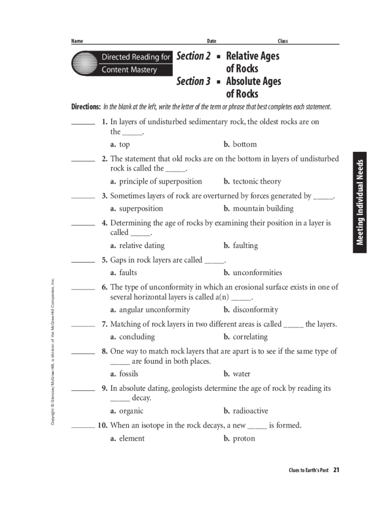 NameDateDirected Reading for Content MasteryClassSection 2Section 3Relative Ages of Rocks Absolute Ages of RocksDirections: In the blank at the left, write the letter of the term or phrase that best