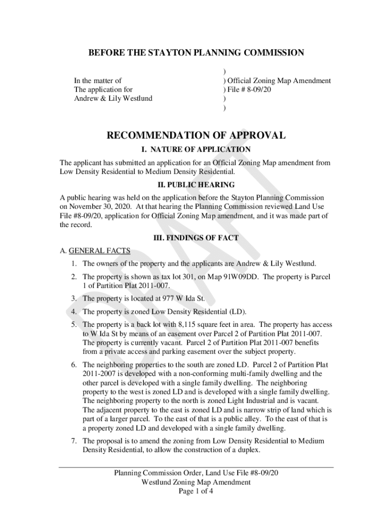 BEFORE THE STANTON PLANNING COMMISSION)) Official Zoning Map Amendment) File # 809/20))In the matter of The application for Andrew & Lily WestlundRECOMMENDATION OF APPROVAL I. NATURE OF APPLICATION