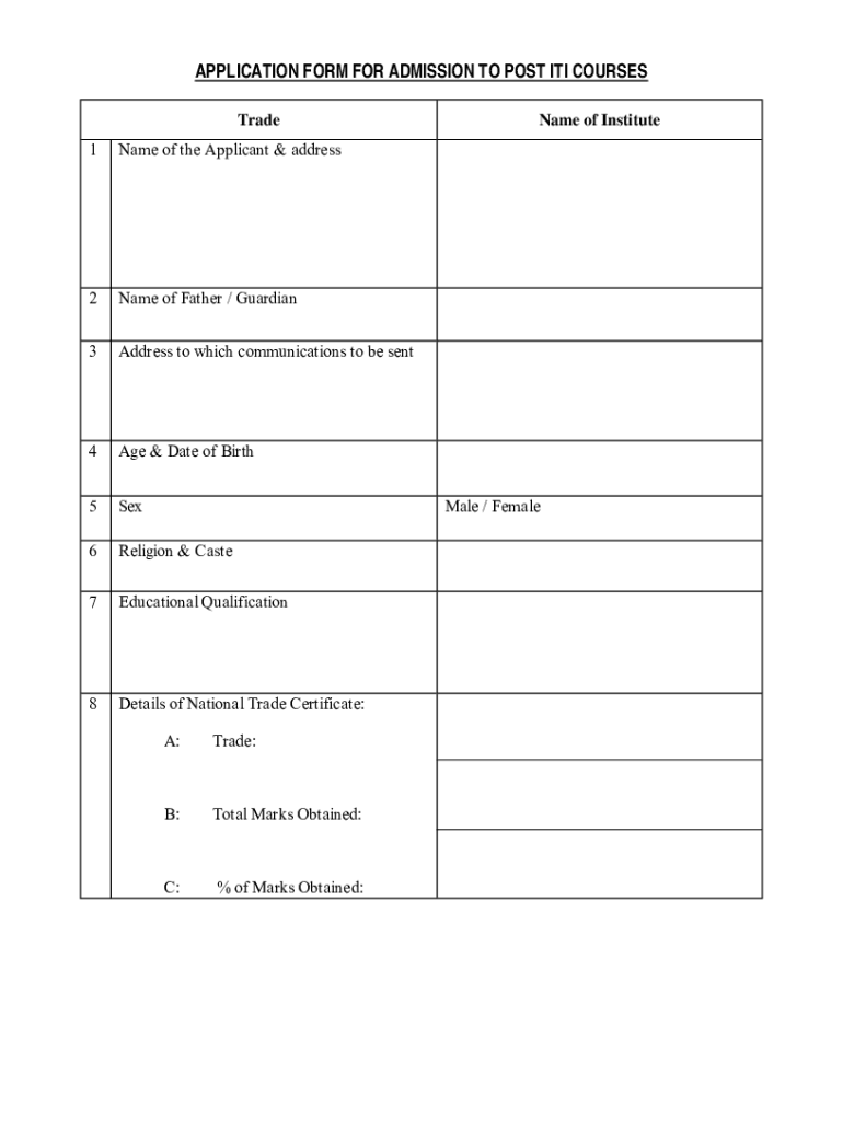 APPLICATION FORM FOR ADMISSION TO POST IT COURSES Trade 1Name of the Applicant & address2Name of Father / Guardian3Address to which communications to be sent4Age & Date of Birth5Sex6Religion & Caste7Educational