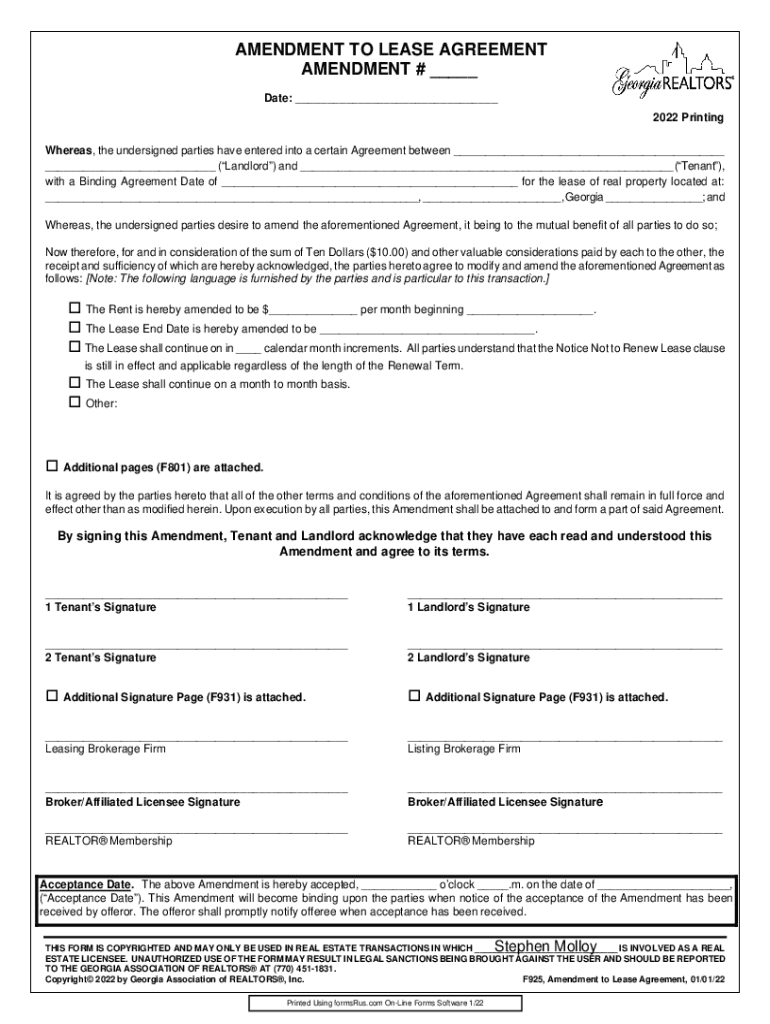 AMENDMENT TO LEASE AGREEMENT AMENDMENT # ___ Date: ___ 2022 Printing Whereas, the undersigned parties have entered into a certain Agreement between ___ ___ (Landlord) and ___ (Tenant), with a Binding