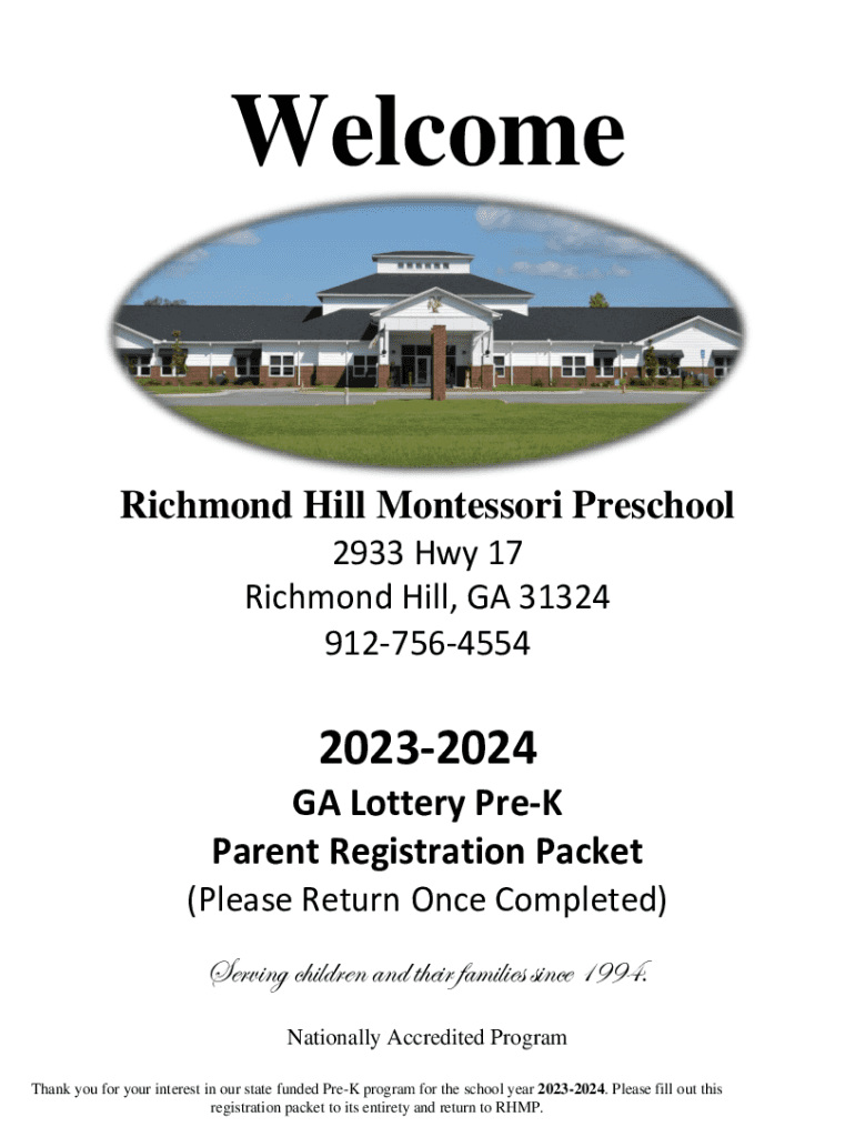 Welcome, Richmond Hill Montessori Preschool 2933 Hwy 17 Richmond Hill, GA 31324 912756455420232024 GA Lottery Prey Parent Registration Packet (Please Return Once Completed) Serving children and their