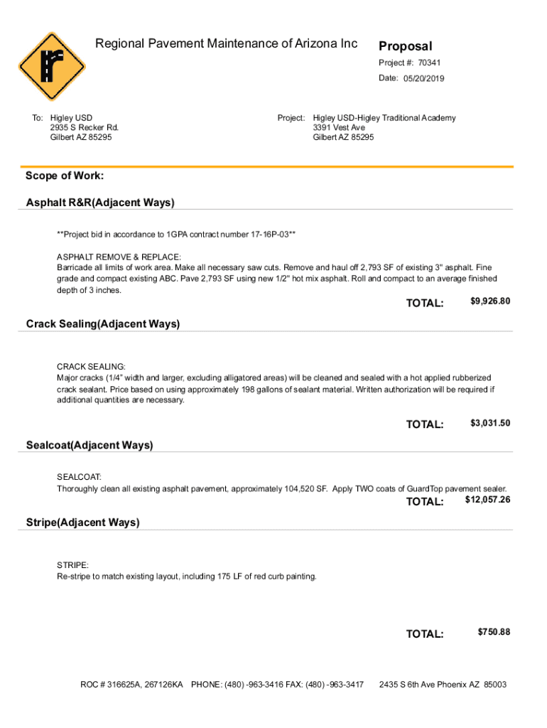 Regional Pavement Maintenance of Arizona Proposal Project #: 70341 Date: 05/20/2019To: Higher USD 2935 S Becker Rd. Gilbert AZ 85295Project: Higher Shirley Traditional Academy 3391 Vest Ave Gilbert
