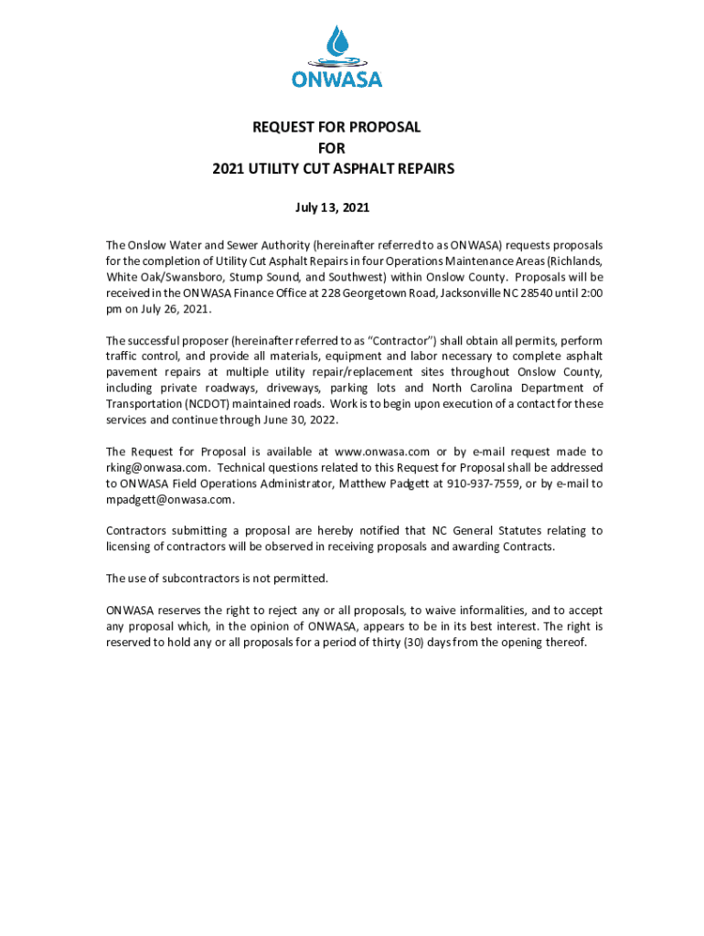 REQUEST FOR PROPOSAL FOR 2021 UTILITY CUT ASPHALT REPAIRS July 13, 2021, The On slow Water and Sewer Authority (hereinafter referred to as NASA) requests proposals for the completion of Utility Cut
