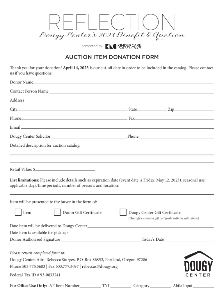 REFLECTIONDougy Centers 2023 Benefit & Auction presented auction ITEM DONATION FORM Thank you for your donation! April 14, 2023, is our cutoff date in order to be included in the catalog. Please contact