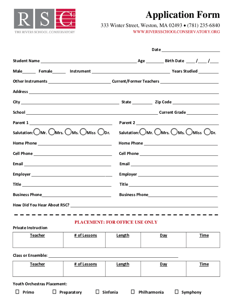 Application Form 333 Winter Street, Weston, MA 02493 (781) 2356840 WWW.RIVERSSCHOOLCONSERVATORY. Ornate ___ Student Name ___ Age ___ Birth Date ___ /___ /___ Male___ Female___ Instrument ___ Years