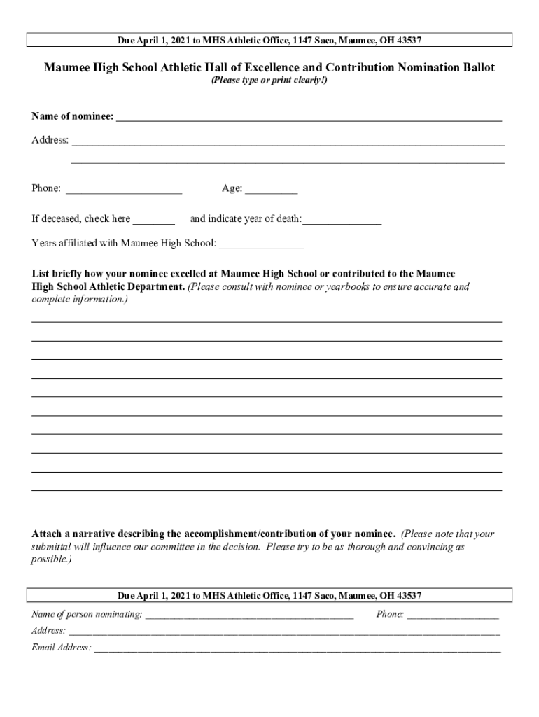 Due April 1, 2021, to MRS Athletic Office, 1147 Sack, Maumee, OH 43537Maumee High School Athletic Hall of Excellence and Contribution Nomination Ballot (Please type or print clearly!) Name of nominee: