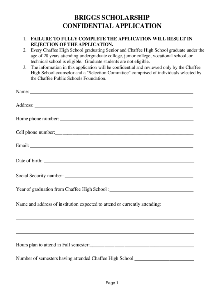 BRIGGS SCHOLARSHIP CONFIDENTIAL APPLICATION 1. FAILURE TO FULLY COMPLETE THE APPLICATION WILL RESULT IN REJECTION OF THE APPLICATION. 2. Every Chaffee High School graduating from Senior and Chaffee