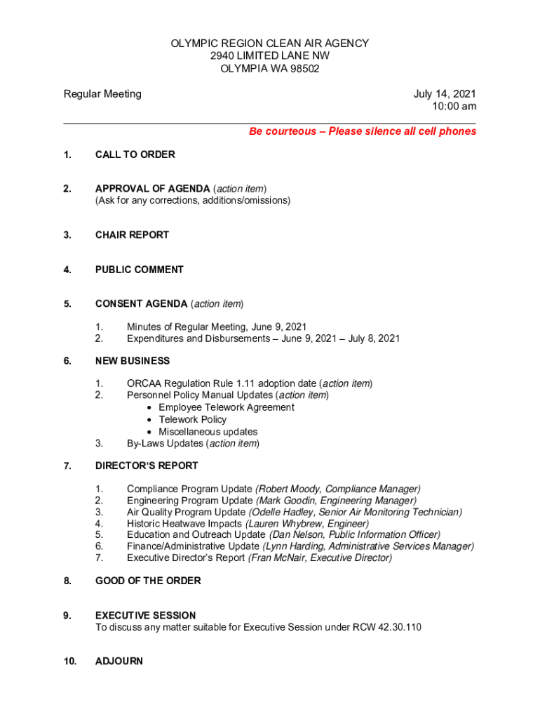 OLYMPIC REGION CLEAN AIR AGENCY 2940 LIMITED LANE NW OLYMPIA WA 98502 Regular Meeting July 14, 2021 10:00 am ___ Be courteous Please silence all cell phones 1.CALL TO ORDER2.APPROVAL OF AGENDA (action