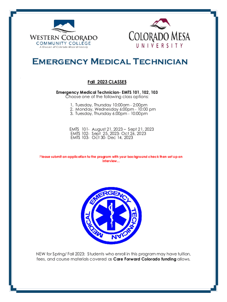 Emergency Medical Technician Fall 2023 CLASSES: Emergency Medical Technician EMTs 101, 102, 103 Choose one of the following class options: 1. Tuesday, Thursday 10:00am 2:00pm 2. Monday, Wednesday