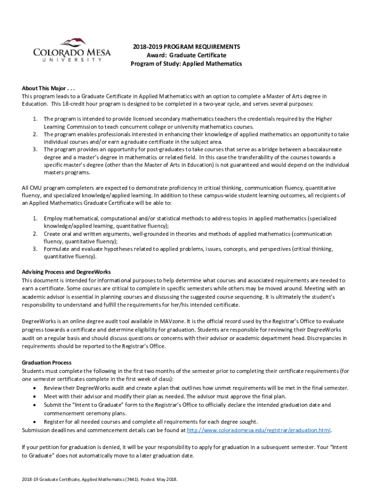 20182019PROGRAMREQUIREMENTS Award:GraduateCertificate ProgramofStudy:AppliedMathematics AboutThisMajor... ThisprogramleadstoaGraduateCertificateinAppliedMathematicswithanoptiontocompleteaMasterofArtsdegreein