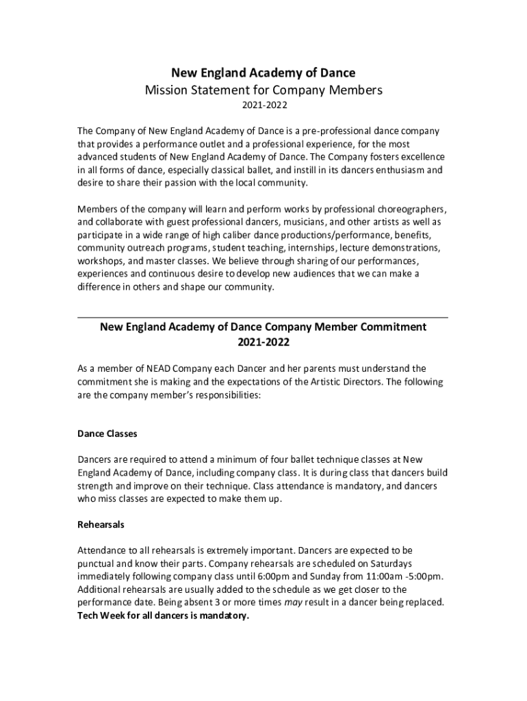 New England Academy of Dance Mission Statement for Company Members 20212022 The Company of New England Academy of Dance is a preprofessional dance company that provides a performance outlet and a