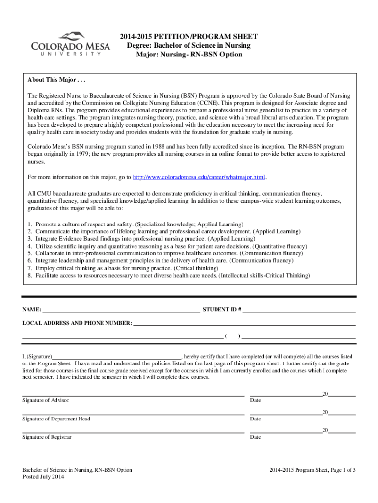 20142015 PETITION/PROGRAM SHEET Degree: Bachelor of Science in Nursing Major: Nursing RN BSN Option About This Major. . . The Registered Nurse to Baccalaureate of Science in Nursing (BSN) Program