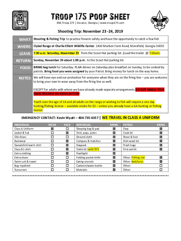 Troop 175 Poop Sheet BSA Troop 175 | Decatur, Georgia | www.troop175.comShooting Trip: November 23 24, 2019 WHAT: WHERE: LEAVE: RETURN: FOOD: NOTES:Shooting & Fishing Trip to practice firearm safety